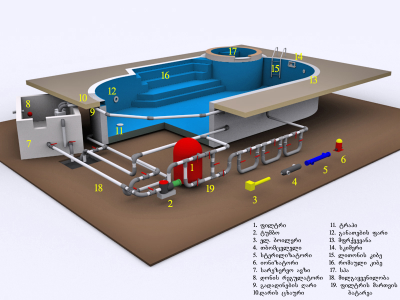 სურათზე შეგიძლიათ გაეცნოთ აუზის მოწყობის პრინციპულ სქემას ძირითად დანაგარებს და მოწყობილობებს.